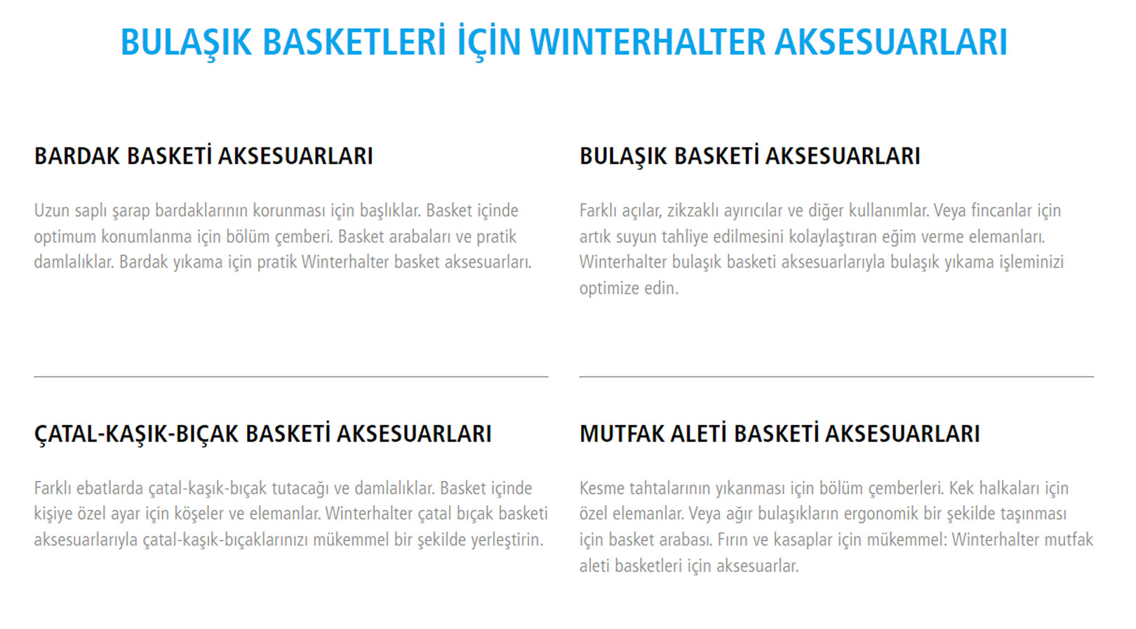 Eğim verme elemanları. Damlalıklar. Basket arabaları. Winterhalter'den, Winterhalter bulaşık basketleri için kapsamlı aksesuarlar. Her basketi kişiye özel bir çözüme dönüştürürFarklı bulaşıklar. Farklı uygulamalar. Gün boyunca farklı kullanımlar. Winterhalter'de her sektör ve her kullanım alanı için uygun bir bulaşık basketi vardır. Özel aksesuarlar sayesinde tamamen size özel bir çözüm ortaya çıkar. Özellikle uzun saplı bardaklar veya krema torbası gibi ekipmanlar mı yıkıyorsunuz? Bulaşıklarınızı basketlere yerden tasarruf edecek şekilde yerleştirmek mi istiyorsunuz? Veya damlayan suları pratik bir şekilde toplamak? Winterhalter basket aksesuarları sayesinde bu mümkündür: İyi düşünülmüş detaylarla. Mükemmel bulaşık yıkama işlemi için..