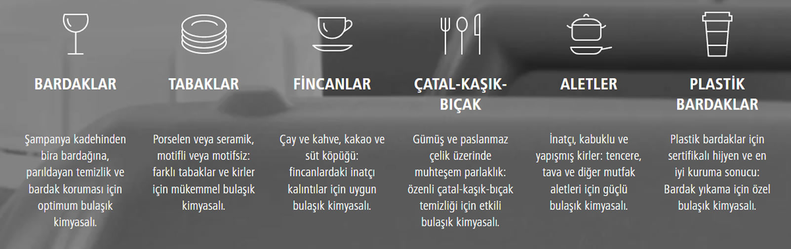 Hafif ve inatçı kirler. Farklı malzemelerden bulaşıklar. Lekesiz ve ışıl ışıl parlaklık. Winterhalter farklı uygulamalar için uygun bulaşık kimyasalına sahiptir.Bulaşık kimyasalı. Genelde makinenin gölgesinde kalır. Çoğu zaman hafife alınır. Ama yıkama sonucu üzerinde belirleyici etkiye sahiptir: Ne kadar etkiliyse, yıkama sonucu da o kadar iyi olur. Bu nedenle bulaşık kimyasalı Winterhalter komple sisteminin değişmeyen ve önemli bir bileşenidir. Bulaşık yıkamanın uzmanı olarak en etkili tarifleri geliştirdiğimiz bir laboratuvara sahibiz. Özel uygulamalar için deterjan ve parlatıcı. Birbirleriyle mükemmel uyumlu. Temizlik ve hijyen konusunda güvenilir.
